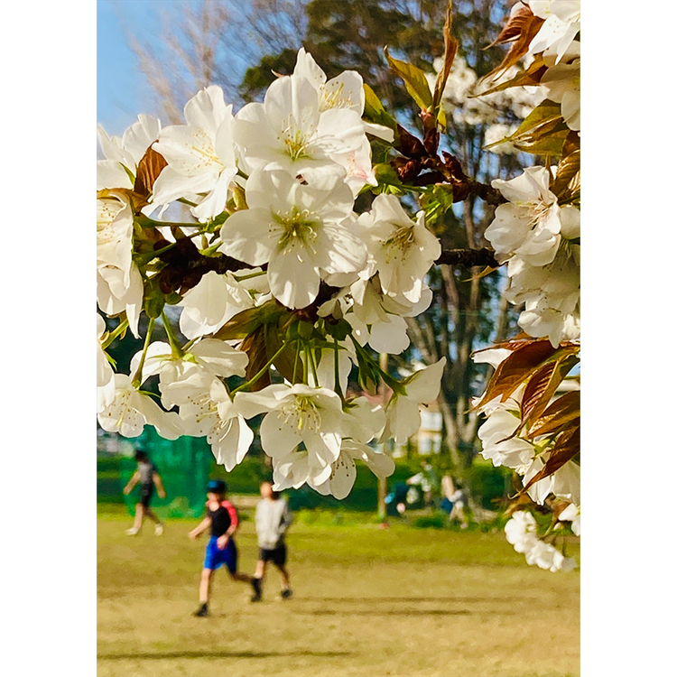 満開の時期を過ぎた桜の下、子どもたちが元気にサッカーを楽しむひととき。